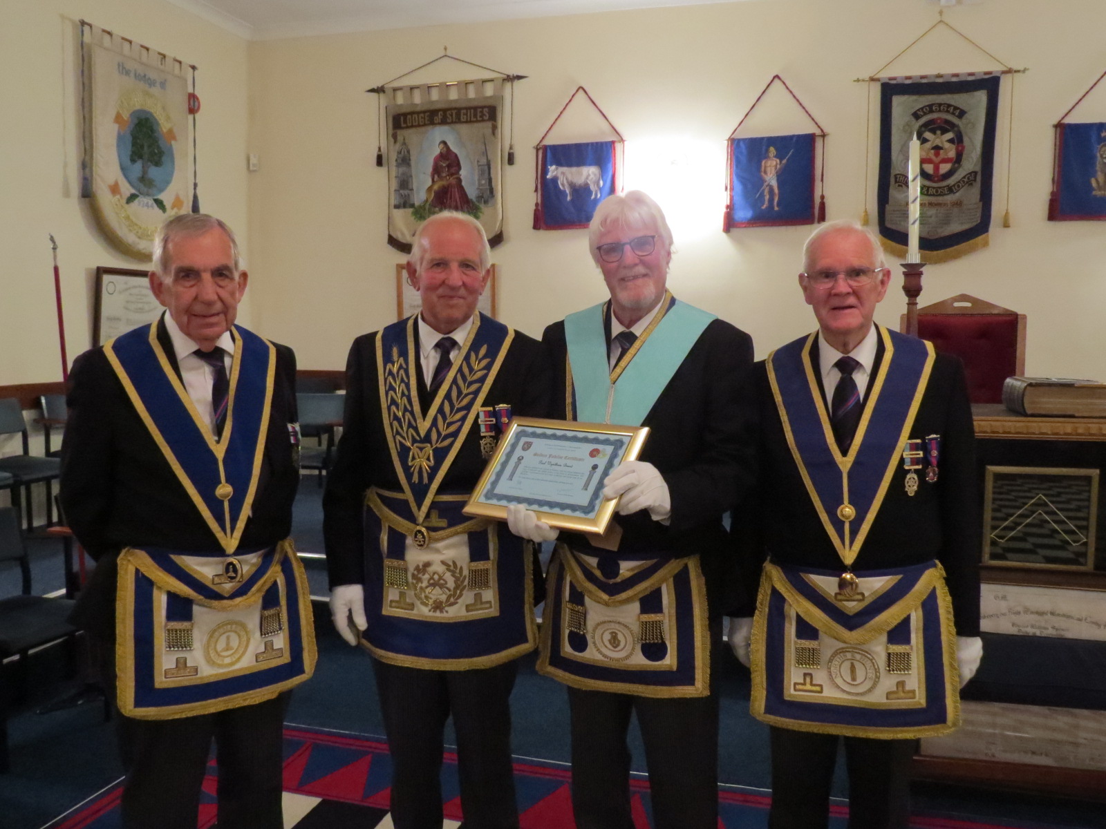 Bro Paul Beard receives his 50 year certificate from WBro F Margot with help from WBros Wayman(l.) and Marris(R.)