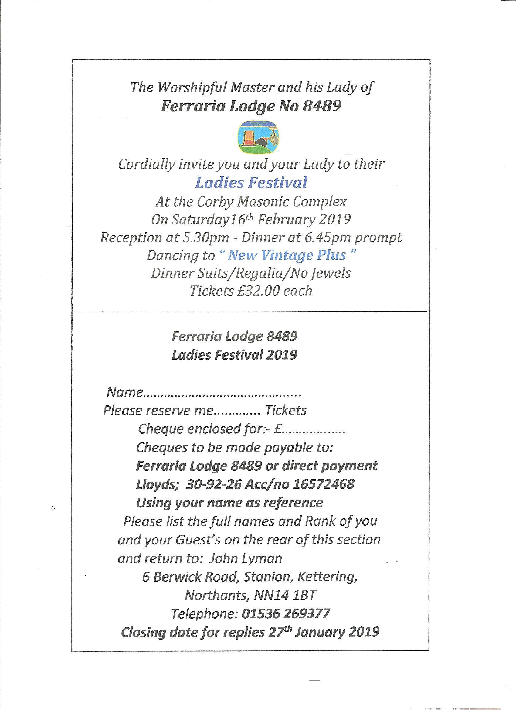 Ferraria Lodge #8489 will be holding their Ladies night on Saturday 16th February 2019.